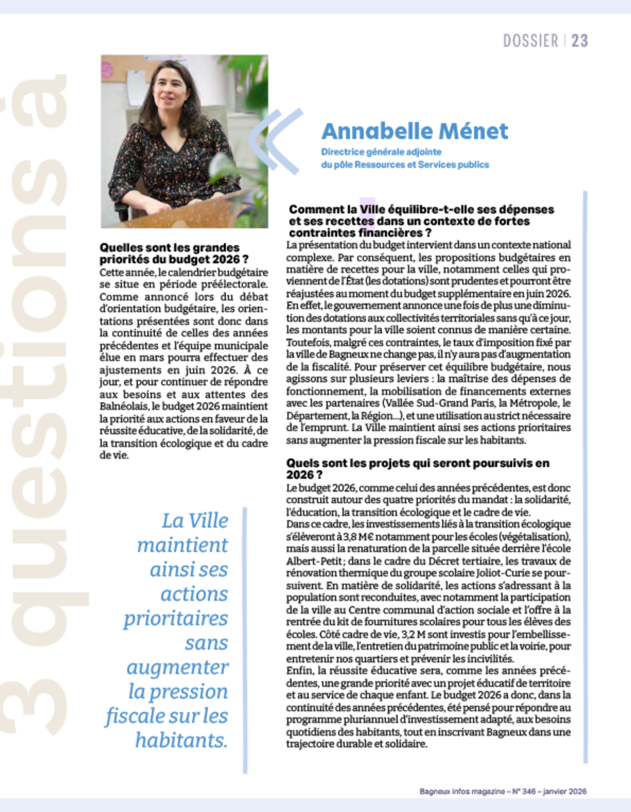 Afin d’en présenter les grandes lignes, la rédaction du B!m a rencontré Annabelle Ménet, directrice générale adjointe du pôle Ressources et Services publics de la Ville, qui revient sur les priorités, les choix réalisés pour le budget 2026.
