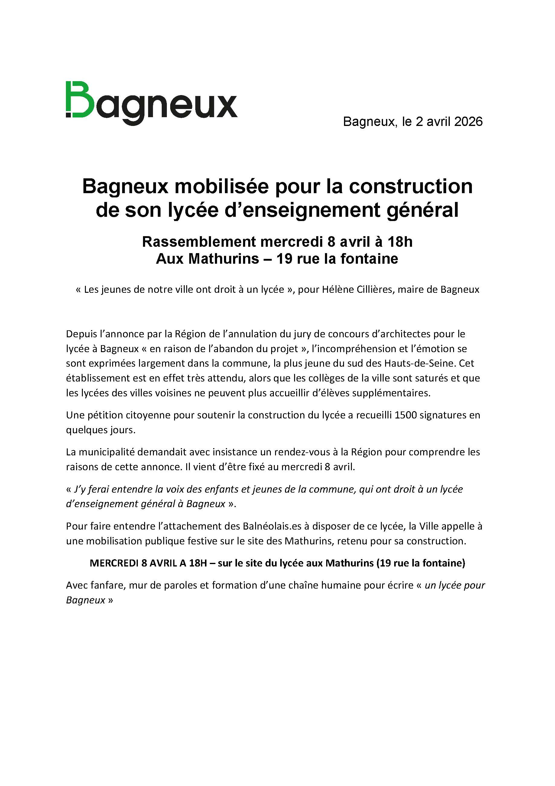 Pour faire entendre l’attachement des Balnéolais.es à disposer de ce lycée, la Ville appelle à une mobilisation publique festive sur le site des Mathurins, retenu pour sa construction.