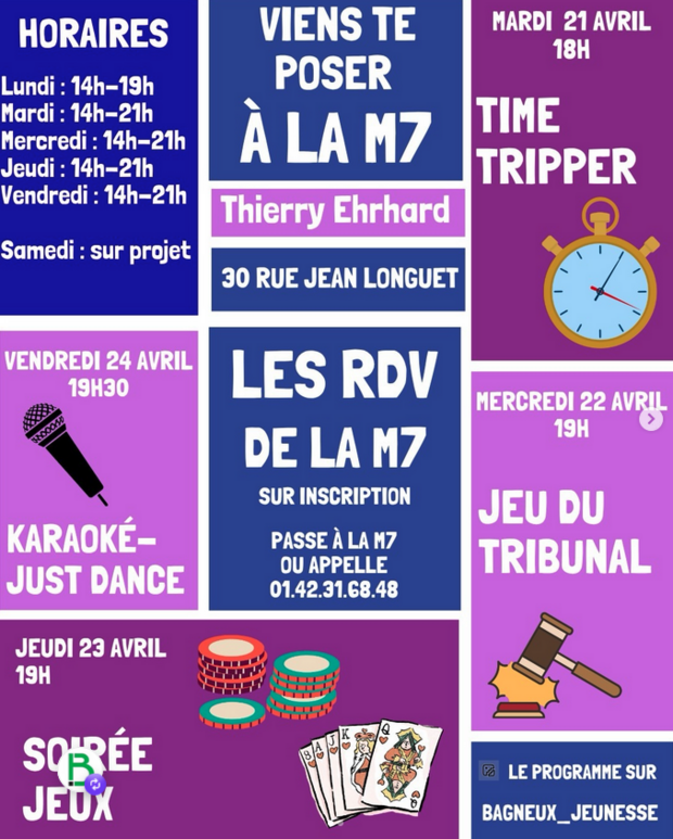 À la M7, structure pour la jeunesse, on prépare un programme de qualité pour ces vacances. Que tu sois un créatif, un orateur ou même un curieux tu viens et tu profites des ateliers. Pour les inscriptions n’hésite pas à passer directement à la M7 sur les horaires d’ouverture.
