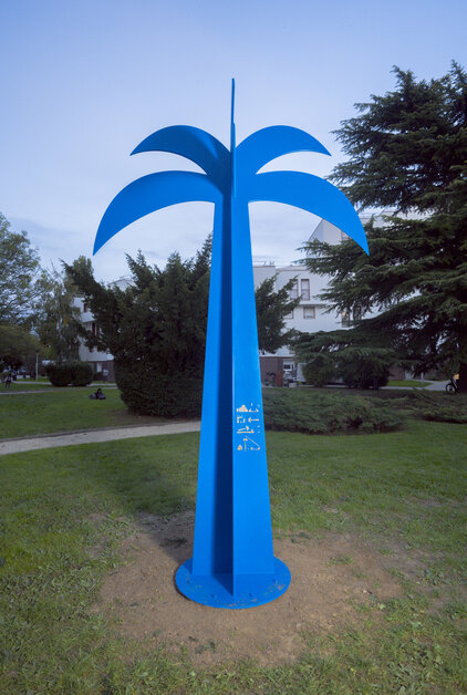 Accompagné par l’artiste-recherchiste Nathalie Talec et l’agence Art City Agency, il a conçu un palmier bleu de 3,70 m, en acier soudé et thermolaqué. Par sa forme et sa couleur, l’oeuvre relie imaginaire naturel et esthétique industrielle, tout en évoquant le déplacement, l’adaptation et la transmission culturelle — autant d’échos aux parcours des habitants. Une gravure dorée, inspirée des dessins techniques du socle de l’obélisque de la Concorde, rappelle enfin la dimension historique et symbolique du geste artistique.