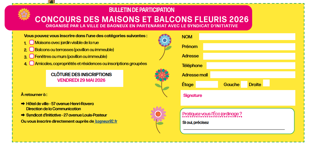 Les inscriptions sont à effectuer jusqu'au vendredi 29 mai 2026 dans le formulaire ci-dessous ou en renvoyant le bulletin d'inscription à l'Hôtel de ville (57 avenue Henri-Ravera) ou au Syndicat d'initiative (27 avenue Louis-Pasteur).