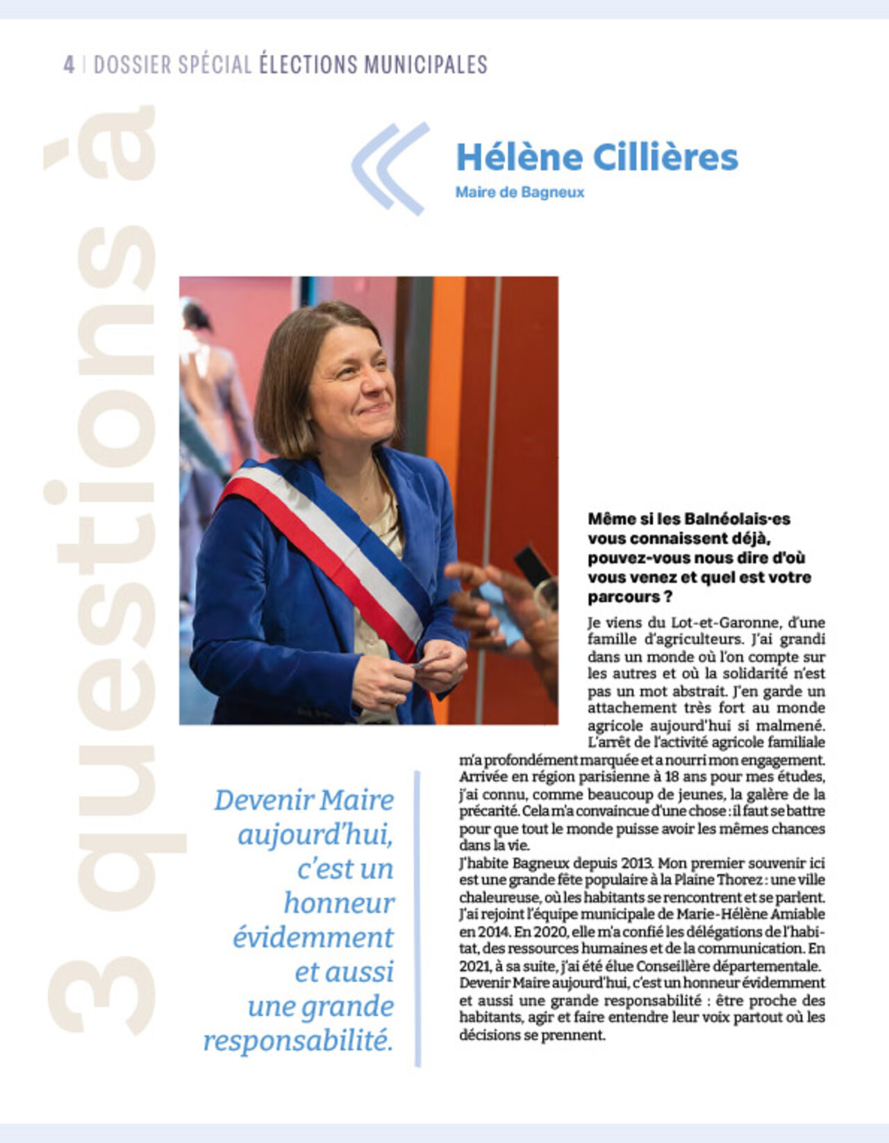 Le 21 mars, le conseil municipal d’installation a élu Hélène Cillières maire de Bagneux, entourée de 15 adjoint•e•s et 20 conseillers•ères municipaux•ales, dont 5 délégué•e•s. Ce moment marque aussi la fin du mandat de Marie-Hélène Amiable, saluée pour ses 22 années d’engagement. Cette transition, inscrite dans la continuité, illustre la volonté d’allier expérience et renouveau.